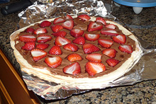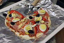 O processo que a gente fez foi o seguinte: eu fiz a massa antes do pessoal chegar e minha mãe picou os ingredientes todos, colocando em potinhos. Daí em diante o meu pai era responsável por abrir a massa, eu fiquei com os recheios e o Gabe com o controle das pizzas no forno e cortando as pizzas prontas pro pessoal comer. Conseguimos uma velocidade boa na produção, se tivesse mais uma pessoa recheando comigo daria pra ter sido um pouco mais rápido.