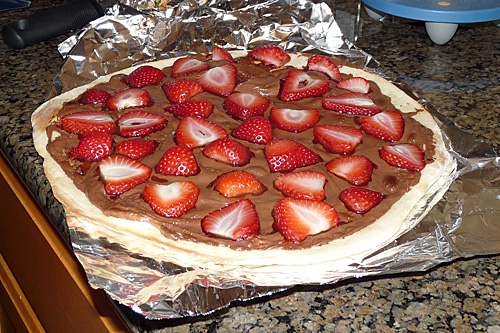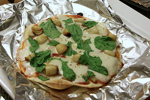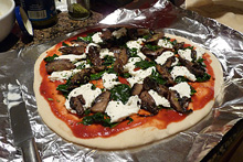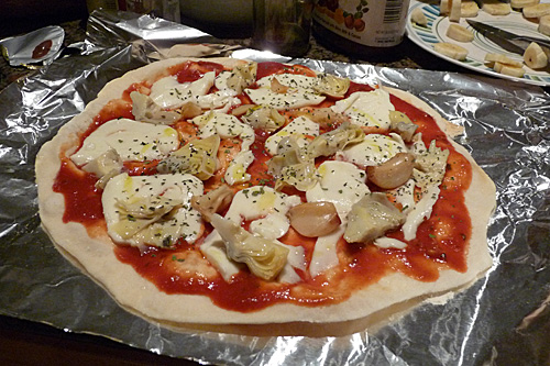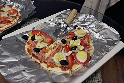 Nós usamos pedras de pizza dentro do forno, que esquentam MUITO e o resultado fica muito melhor do que formas de pizza de metal. As pedras ficam o tempo todo dentro do forno, quando você liga para pré-aquecer elas já tem que estar lá dentro (tem pedras que tem pegas laterais de metal para que você consiga colocar e tirar do forno facilmente, mas não recomendo porque a temperatura de uma pedra é muito mais alta do que a de uma forma – de qualquer forma dá certo, nós já fizemos isso no passado também, já usamos formas de metal, enfim). Se você for deixar a pedra dentro do forno, você precisa de um pizza peel (não consegui descobrir o nome em português, se alguém souber me fale), que é aquela pá de madeira pra colocar e retirar a pizza do forno. Nós temos um feito de bambu que funciona muito bem. Pra agilizar ainda mais, dessa vez nós usamos papel alumínio embaixo das pizzas pra deslizar mais rapidamente do pizza peel para a pedra e pra passar a massa de um pro outro pra rechear, assar, etc. Mas se você não estiver fazendo pizza pra muita gente isso não é necessário.