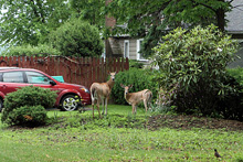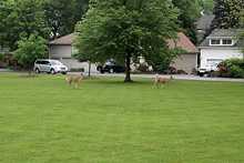 Depois de um final de semana de sol e temperatura perfeita, a segunda-feira amanheceu com chuva. Ficamos todos decepcionados, afinal vinha a família toda pra um churrasco de Memorial Day e churrasco com chuva não é lá essas coisas…Dois veadinhos vieram visitar (tem muitos aqui na ilha) e estavam comendo umas plantas do jardim da minha sogra na maior cara-de-pau (os moradores aqui tem que estar sempre pesquisando quais plantas são as favoritas dos cervos e quais eles não gostam se quiserem ter um jardim que sobreviva).