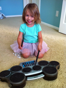 Hehehe, ela adora música. Inventa músicas, fica cantando pela casa, pede pra ouvir os CDs preferidos pra cantar junto e vivia tocando “bateria” em tudo que via pela frente (pegava uns galhos de árvore no quintal e ia batucando em tudo). Aí “oficializamos” com essa bateriazinha (eu queria uma tradicional mas não achei nada do tamanho dela, só tem pra criança maior). E o violão o meu pai toca, ela adora, então compramos esse pequenininho pra ela brincar também. O pai do Gabe toca viola em orquestra nas horas vagas e os tios todos tocam algum instrumento (o Gabe também, toca piano e canta) então música está na família 🙂