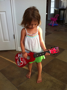 Demos os presentes de aniversário da Julia essa semana já que vamos pro Brasil na segunda e não queríamos levá-los. Ela está amando a bateria, e quando quer tocar o ukulele (que é a versão havaiana do nosso cavaquinho no Brasil) ela pede pro Gabe pegar o violão do meu pai pra tocar junto.