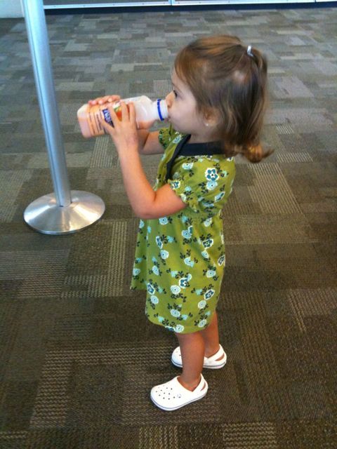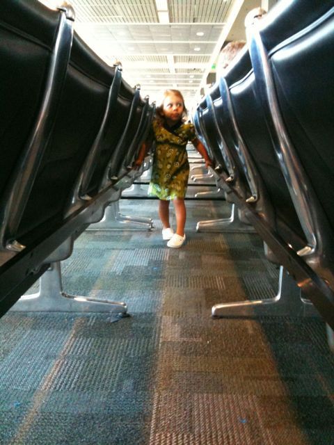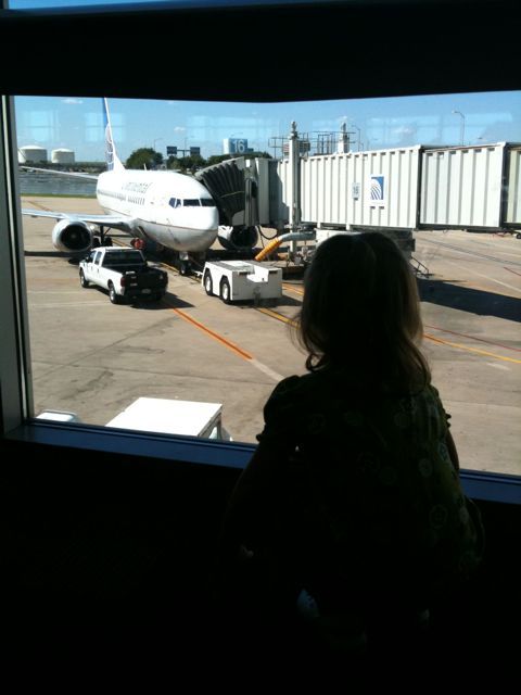 Esperando o voo pra Houston e depois, Rio! Julia fazendo hora sentada no carrinho (assistindo filme no computador, depois da foto), fazendo um lanchinho, brincando de andar pelo “tunel” entre as cadeiras e olhando os avioes parados em cada portao…