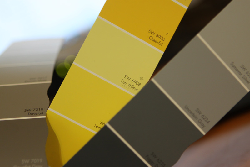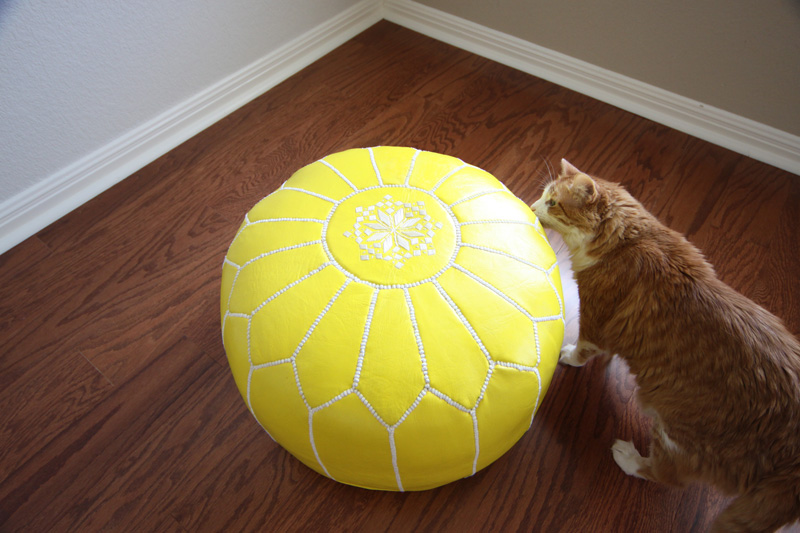 Linda essa combinacao de cinza e amarelo, super original. E o gato conferindo o novo objeto da casa, muito fofo.