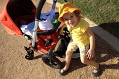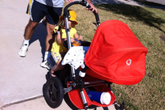 Quando fomos a Amsterdam ano passado vi um monte de mães chegando no parquinho do Vondelpark empurrando seus carrinhos de bebê com o filho mais velho sentado numa cadeirinha conectada atrás do carrinho. Aqui nos EUA eu já tinha visto uma plataforma para dar carona pro filho mais velho no carrinho de bebê, mas essa cadeirinha achei muito mais legal. Pensei com os meus botões que ia comprar quando voltasse pra casa, achando que era um acessório do Bugaboo (que era o carrinho que todas elas tinham – é uma marca holandesa – e é o carrinho que usamos no dia-a-dia desde que a Julia nasceu).