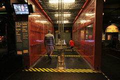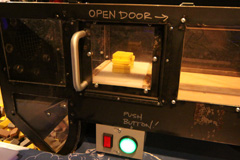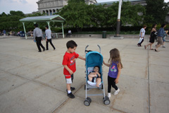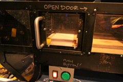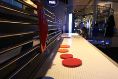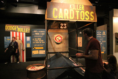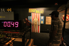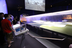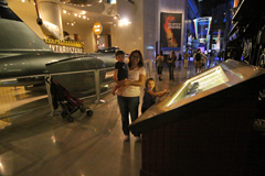 Começamos indo direto na exposição temporária Mythbusters, do programa de TV de mesmo nome. O Gabe é superfã do programa, que testa cientificamente vários mitos que a gente ouve no dia-a-dia, vê nas telas do cinema ou lê em livros, por exemplo – é possível desviar de uma bala de revólver, como os super heróis e mocinhos de filme vivem fazendo? Se você correr na chuva, vai se molhar menos do que uma pessoa andando? Dá mesmo pra puxar a toalha de uma mesa sem derrubar e quebrar tudo que está em cima? A exposição mostra tudo isso de maneira interativa: você pode correr ou andar debaixo de uma simulação de chuva e ver quem se molhou mais depois; pode puxar a toalha de uma mesa com itens de plástico pra não quebrar; medir qual é o seu tempo de reação saindo da frente de uma suposta bala de revólver ao ouvir o barulho do tiro, e por aí vai. Achamos a exposição divertida, mas nem ficamos muito tempo por lá, porque ao contrário do que o pessoal do museu falou, as crianças não curtiram muito não (só crianças mais velhas pra entender essas coisas). Essa exposição vai até 3 de setembro de 2012.