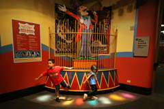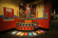 Por último voltamos para o piso principal e demos um pulinho na parte de Circo, Julia e João gostaram de brincar com uma instalação de luzes e som: você pisa em cada foco de luz e um som diferente é tocado, eles fizeram uma música pulando pra todo lado.