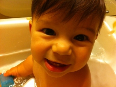 Esse post está saindo atrasado porque o Eric fez 8 meses enquanto eu estava no Brasil. Eu liguei pra casa pra falar com todo mundo pelo Skype e cantamos parabéns pra ele, que adora a musiquinha e fica todo contente. O Gabe me mandou essa foto dele todo descabelado no final do dia depois que deu o banho nele antes de dormir (aliás, o Gabe adora bagunçar o cabelo do Eric durante o banho, tem cada foto hilária). Nosso bebezão completou 8 meses se arrastando pela casa: eu digo que ele é uma minhoca, porque ele não engatinha direito; vai se arrastando levantando a bunda que nem uma minhoca. Mesmo assim ele consegue ir pra onde quer e os cuidados agora tem que ser em dobro, porque ele é curiosíssimo e quer abrir todas as gavetas, subir em todas as mesas e puxar todas as cadeiras. Já começou a perseguir o Gato pela casa, é só o Gato estar sentado num lugar perto dele que ele vai minhocando desesperado até quase colocar a mão no Gato – e aí o Gato muda de lugar. A coisa se repete até o Gato se retirar do ambiente, como quem diz “agora chega”.