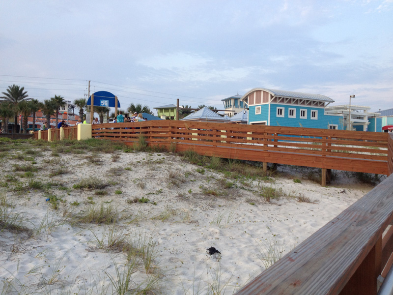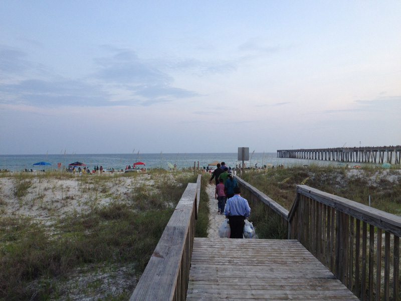 Finalmente vi a praia da cidade, que é enorme (são mais de 30km de praia contínua), tem areia bem branquinha e água linda esverdeada (essa região se chama Emerald Coast – costa Esmeralda). Pra quem não acompanhou no Facebook e no Twitter, no sábado o Eric ficou doente (começamos o dia no Children’s Hospital de Mobile, no Alabama, onde tínhamos passado a noite com ele sem dormir) e no domingo eu também fiquei doente, então não pisamos na praia até terça, depois que meu sogro chegou com a família. Hoje que estávamos animados pra passar o dia na praia, mas choveu. A praia é pública e mesmo nos trechos onde tem vários hotéis na areia, tem sempre as passagens pra quem não está hospedado ali entrar. Tudo bem organizadinho.