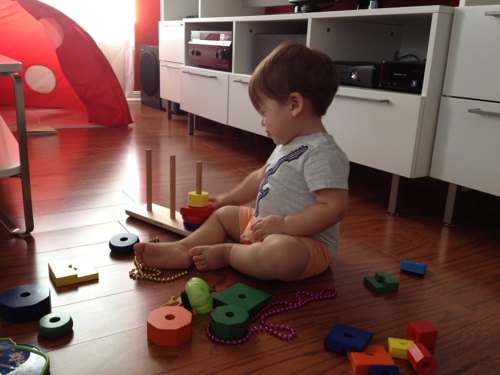 Pirâmide de argolas: nós temos uma de pano que foi da Julia quando bebê e os dois usaram bastante; no Natal o Eric ganhou uma de madeira super bacana, tem três tipos de formas (círculos, quadrados e hexágonos) pra empilhar, ele brinca com essa pirâmide todos os dias.