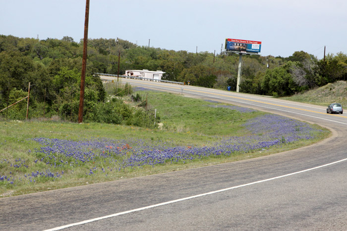 Você vai dirigindo e vendo as bluebonnets e outras flores silvestres na beira da estrada, aquela massa de flores azuis-arroxeadas, às vezes salpicadas com flores amarelas (greenthread e outras), cor-de-rosa (buttercups), rosa-choque (winecups) ou laranjas (Texas paintbrush). Fomos parando e tirando fotos no caminho, as crianças estavam dormindo no carro, até chegarmos a Burnet.