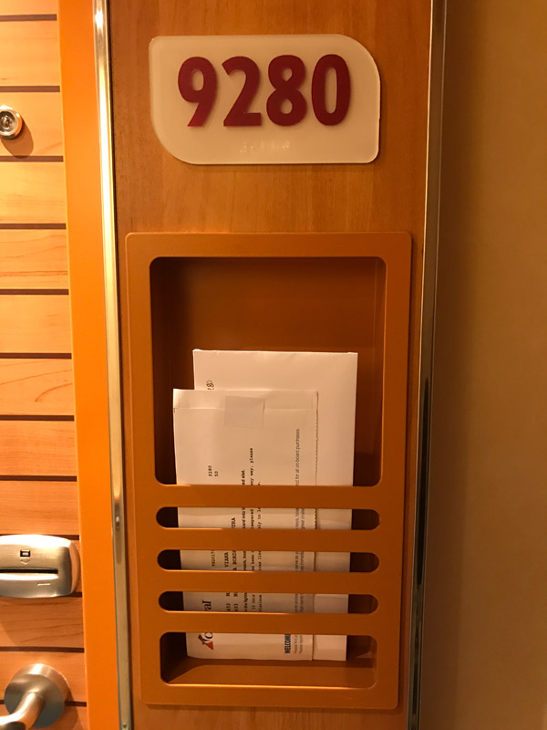 O embarque em Miami foi bem rápido: nós chegamos na hora marcada (tinha uma fila pra quem estava na hora e uma fila pra quem estava atrasado), e como tínhamos feito o check in online, assim que passamos pela segurança já fomos logo entrando no navio. Os nossos cartões chave da cabine estavam em um envelope na “caixa de correio” da cabine, então entramos no navio e fomos logo lá pegar. Como esse era o nosso primeiro cruzeiro Carnival, ficamos um pouco perdidas com essa entrada, achando que tínhamos que passar em algum lugar pra pegar os cartões. Aí perguntamos onde tínhamos que ir e eles explicaram que estaria na porta da cabine. Super prático, certamente!