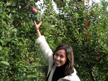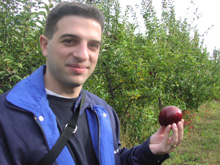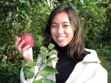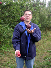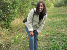 Brincando com as maçãs que estavam no chão. Enquanto centenas de maçãs maduras aguardam serem colhidas.