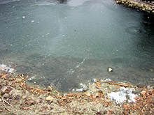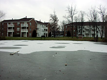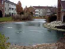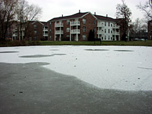 Na quinta passada tirei as fotos dos lagos congelados lá no condomínio que eu morava. Tem um monte de placas “CUIDADO GELO FINO” porque sempre tem alguém que resolve andar no lago congelado e acaba caindo porque o gelo quebra, ainda não está frio por tempo suficiente para a água congelar 100%. E olha que esses lagos são rasos, acho que a água bate no meu joelho, se tanto.