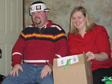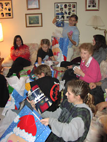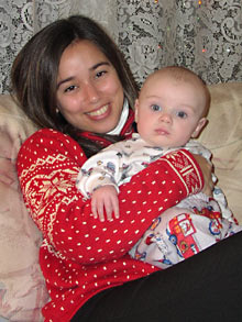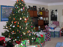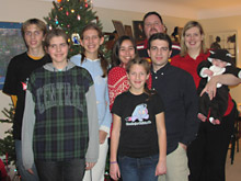 Update: Essa árvore e a casa onde está a árvore é da tia do Gabe, irmã do pai dele. Essa galerinha na foto: eu, Gabe, o primo dele Patrick e a esposa, Stacie, com o filhinho deles no colo, Connor. Os 4 adolescentes são os meus cunhados, Marissa, 16 anos, Daniel, 14 anos e acreditem se quiser, as gêmeas Rebecca e Alana de 11 anos. A família toda tem 2m de altura, só o Gabe é baixinho porque puxou à mãe. Os irmãos dele na foto são filhos do segundo casamento do pai dele. Um dos meus presentes foi uma webcam, para eu poder falar com a minha família no Brasil vendo a carinha deles e eles a minha. Patrick e Stacie são ótimos, ele é muito engraçado, está sempre fazendo piadas. O bebê em todas as fotos é o filho deles, Connor, que tem 4 meses.