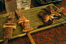 Achamos um restaurantezinho de yakitoris, o menu inteirinho era no espeto. Pedi cogumelos com pasta de camarão, polvo e camarões, o Gabe foi de frango com manjericão, carne com cebola e frango com wasabi. Gostosinho, tudo bem fresco. Não conseguimos saber o nome do restaurante com certeza, porque estava tudo escrito em japonês, acho que era Tatumi. Na saída, vários japoneses bêbados sendo carregados pelos amigos nas ruas de Shibuya, não sei se é só porque é sexta-feira ou se é sempre assim em Shibuya 🙂