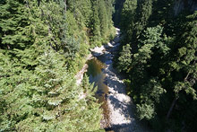 Claro que a ponte atualmente é feita de materiais high-tech, e não de madeira com cordas como era no passado, então ninguém precisa ficar com medo de atravessar. A ponte tem 140m de comprimento e são 70m de altura até o rio lá embaixo, no meio de um parque muito verde lindíssimo. Tem alguns totens dos índios canadenses também, como no Stanley Park, mas esses são menores. O visual do lugar é lindo, e quando estávamos atravessando a ponte, uma águia resolveu passar voando pelo vale e por baixo da ponte! Foi incrível, infelizmente eu tinha guardado a câmera nessa hora e não consegui uma foto. Guardei na memória, pra sempre. A ponte balança um pouco quando você passa, mas nada demais. Estava bem cheia, muita gente atravessando, em mão dupla 😉