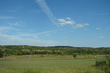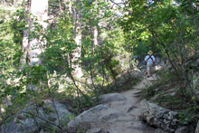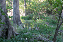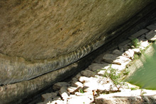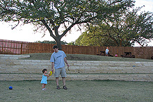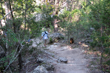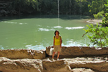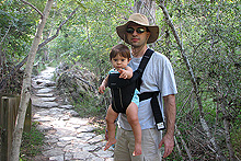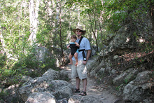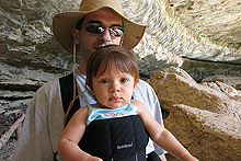 No finalzinho do dia resolvemos fazer um passeio até Hamilton Pool, um parque e reserva ecológica que já faz tempo estava na nossa lista de lugares a serem visitados. Chegamos lá quase na hora que eles fecham, mas como não fomos para nadar, só para caminhar até a piscina natural, deu tempo de ir e voltar com tranqüilidade. Foi bom porque o pessoal já estava indo embora e não tinha muita gente. Realmente o lugar é lindo, para chegar na piscina você tem que pegar uma trilhazinha pedregosa que vai descendo o morro até chegar no fundo do canyon. Para descer com a Julia só usando o Baby Bjorn mesmo, e muito cuidado para não escorregar. Muitas árvores garantem sombra e tornam o lugar bem fresquinho, uma delícia andar por lá. Julia ficou prestando muita atenção em tudo, concentrada, observando os mínimos detalhes.
