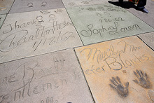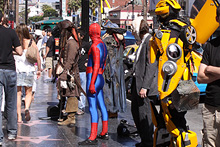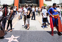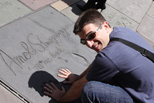 Descemos rumo a Hollywood Boulevard, que é onde ficam os cinemas e teatros famosos e todos os doidos fantasiados na calçada da fama. Estacionamos perto do Grauman’s Chinese Theatre, que ainda é usado em muitas premieres de filmes importantes até hoje. É na entrada do Chinese Theatre que fica a famosa calçada com as pegadas, assinaturas e mãos dos artistas gravadas no cimento. Estava lotado de gente e cheio de gente fantasiada tirando foto com os turistas: de Marylin a Superman, passando por Piratas do Caribe, Mickey e outros super heróis. Logicamente eles tiram fotos em troca de gorjetas…