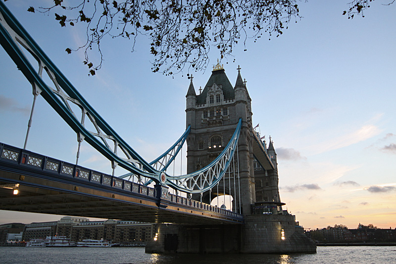 A essa altura o dia estava bem bonito, quase na hora do pôr-do-sol, fomos andando até a Tower Bridge, que é a ponte mais pitoresca da cidade. Julia já tinha visto a Tower Bridge em vários filmes da Disney (Tinkerbell e Peter Pan por exemplo) e reconheceu logo. Estava um vento absurdamente frio na ponte, atravessamos batendo os dentes e mal paramos pra tirar fotos. Chegamos do outro lado procurando um lugar pra tomar um chá e chocolate quente pra esquentar, e fomos no Most Bar Cafe que fica bem embaixo da ponte, é minúsculo mas tem uma vista bacana bem no nível da água.