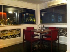 Vamos ao que interessa: a comida. Como da primeira vez, foi tudo excelente. Os gougères fofinhos maravilhosos abrindo a noite, e como comer uma nuvem de queijo. Depois uma salada de chicoria frisée com abobora e sementes de abobora espetacular – como disse o Gabe que e admirador de saladas, essa e das que ele pode pedir de sobremesa (nao e forca de expressao, quando ele gosta muito de uma salada as vezes pede de novo no final de sobremesa). As aboboras assadas levemente adocicadas e macias, a semente dava o crocante e a chicoria era o sabor perfeito pra contrastar com a abobora. O prato principal foi um file na manteiga de ervas com umas batatinhas divinas que eu perguntei o nome duas vezes mas nao gravei. Eu que nao sou chegada em batata queria mais. A carne era maravilhosa, o unico comentario do Gabe foi que podia estar um tiquinho mais cozido pro nosso paladar, mas nada que comprometesse a carne de primeirissima, delicioso de todo o jeito. Na hora da sobremesa o servico normalmente impecavel se enrolou e esperamos no minimo uns 30 minutos, nao sei por que. A espera foi recompensada por uma tortinha de maca derretendo na boca, quentinha, uma coisa. Na saida os famosos brigadeiros de colher, tudo muito bem feito e lindamente apresentado.
