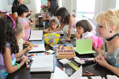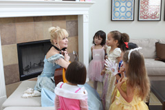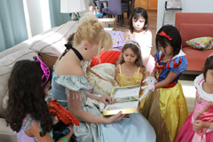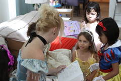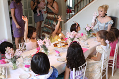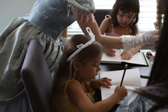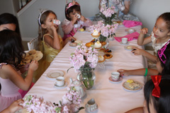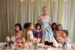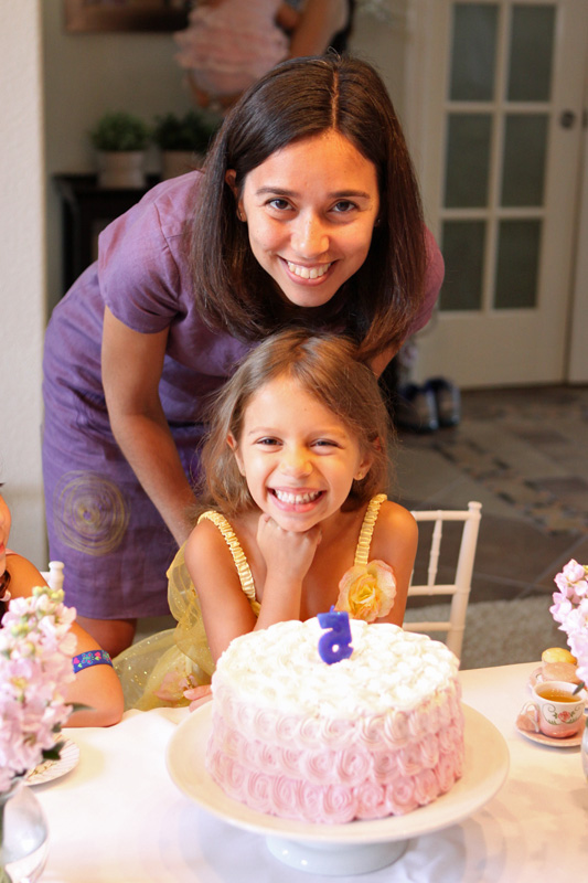 No sábado fizemos a festinha de 5 anos da Julia, que foi um chá das princesas aqui em casa. Ela convidou algumas amiguinhas (só meninas) e estavam todas com seus vestidos de princesa, e eu fiz a decoração como se fosse mesmo um chá da tarde bem tradicional. O Eric era o único menino da festa, e ficou vidrado na bagunça das meninas! A Julia não sabia, mas eu contratei uma Cinderela para aparecer na festa, ler uns livros (incluindo o Paper Bag Princess, do qual já falei aqui) e bater um papo com elas sobre princesas inteligentes, beleza não é tudo e afins, porque como vocês sabem eu não sou muito fã da obsessão com princesas que corre solta aqui nos EUA. A Cinderela também tocou violão e cantou, desenhou com as meninas e tomou o chá com elas. Na hora que ela foi embora as meninas correram todas pra porta pra olhar, acho que elas pensavam que a Cinderela ia sair de carruagem ou algo parecido!