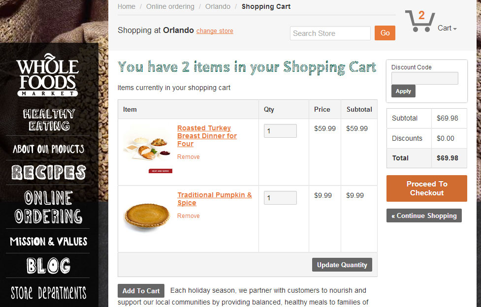 7. Clique no carrinho (Cart) e depois em Proceed to Checkout pra começar a colocar seus dados, cartão de crédito, etc. Você vai ter que escolher o dia e horário que vai buscar a sua ceia.