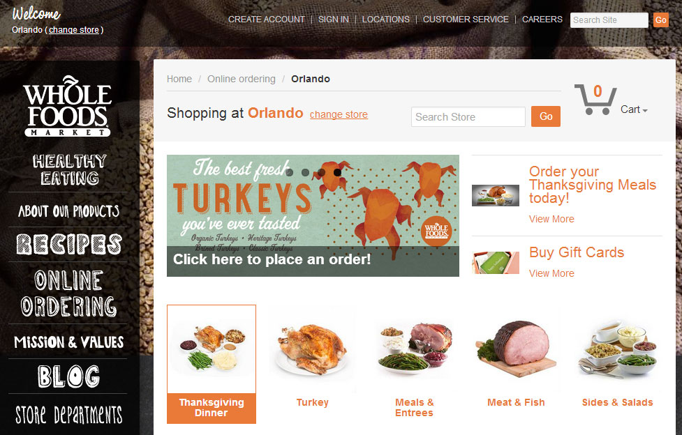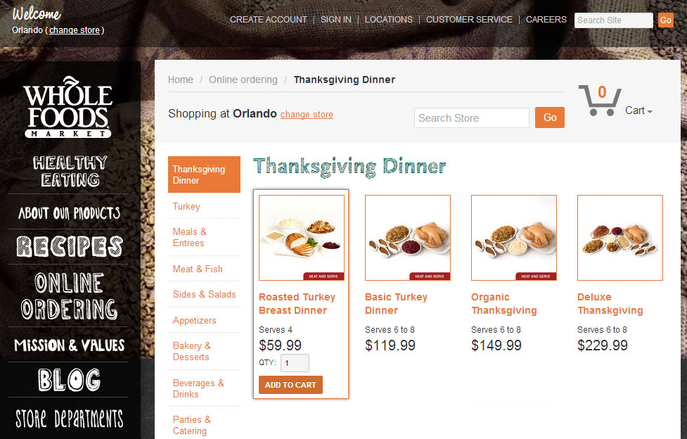 4. Vai aparecer então uma página mostrando as categorias que você pode escolher: Appetizers (aperitivos), Bakery and Desserts (Padaria e Sobremesas), Beverages and Drinks (Bebidas), Breakfast (Café-da-manhã, depende da cidade), Hannukah (Chanukah, depende da cidade), Gifts (Presentes, depende da cidade, que são coisinhas pra levar de presente pra quem organiza um jantar), Meals and Entrees (Refeições e pratos principais), Meat and Fish (Carnes e Peixes), Parties and Catering (Festas e Catering), Sides and Salads (Acompanhamentos e Saladas), Thanksgiving Dinner (Ceia de Thanksgiving), Turkey (Peru), Wine (vinho, depende da cidade) e Wine Club (Clube do Vinho, depende da cidade). Vou focar em Orlando que é onde a gente vai passar o Natal.