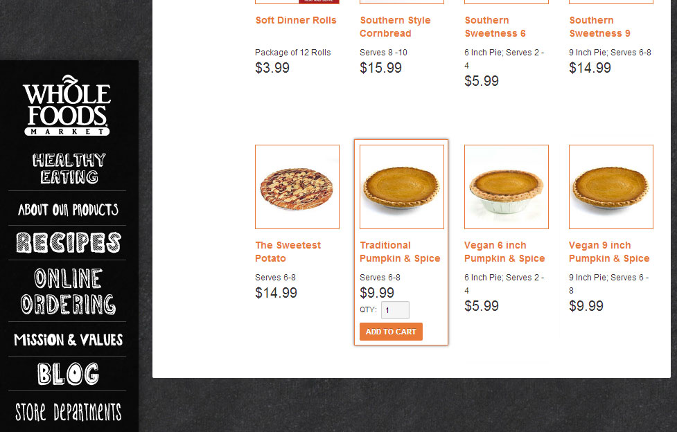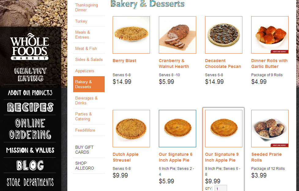5. O que eu fiz em 2011 foi escolher um Thanksgiving Dinner para 6-8 pessoas e adicionei as sobremesas (duas tortas que escolhi em Bakery and Desserts – uma torta de abóbora tradicional e uma torta de chocolate com nozes pecans), mas você pode escolher o que quiser separadamente, de acordo com as suas preferências.