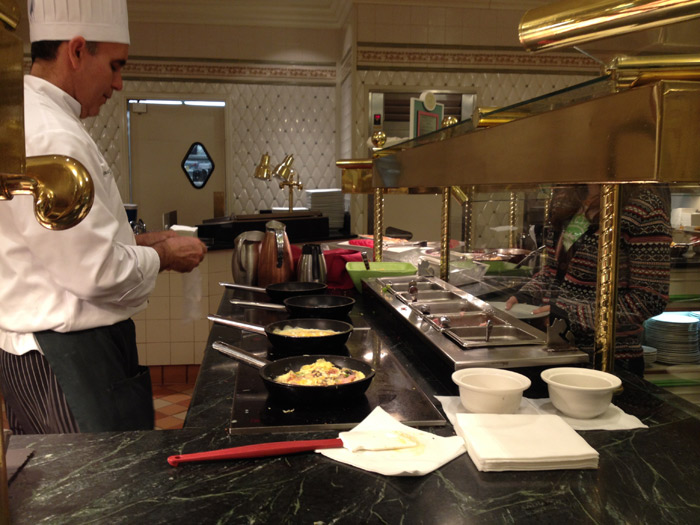 O buffet é muito bom, tem uma estação de ovos e omeletes que são feitos na hora, de acordo com o que você pedir (eu pedi uma omelete, escolhendo os ingredientes, muito boa), vários pães doces ou salgados, bolinhos, waffles com a carinha do Mickey, panquecas, frutas diversas, bacon, linguiça, presunto, salmão defumado, iogurte, é pra comer muito mesmo. A garçonete fica o tempo todo enchendo o seu copo de suco de laranja feio na hora como se fosse água, se não quiser beber avise pra ela parar de ficar completando.