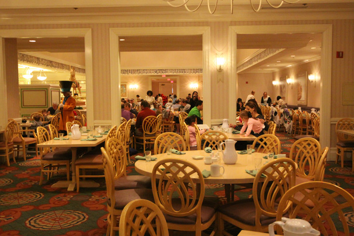 Você entra no lobby do Grand Floridian e o restaurante fica do lado esquerdo, logo depois do balcão de check in do hotel. Fizemos o check in e eles tiram uma foto em família com a árvore de Natal que fica na entrada do restaurante, para vender pra você depois. E aí você entra no restaurante, é levado até a sua mesa, onde a garçonete fala do buffet e anota se alguém quer café, chá, suco de laranja e avisa que os personagens vem nas mesas.