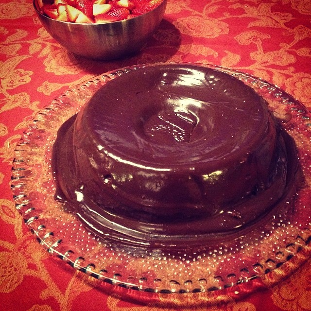 São três tipos de chocolate: nutella, chocolate em barra e chocolate em pó. Eu comprei chocolate em barra Lindt 70% cacau e Chocolate em pó Holandês, então ele ficou muito mais pra bolo de chocolate do que de nutella, da próxima vez a Lena já me falou pra usar chocolate ao leite ou se encontrar, chocolate gianduia, pra ficar com mais gosto de chocolate com avelãs. Mesmo assim ficou divino, úmido, uma coisa. E é claro que a minha mãe é a rainho do bolo então com uma receita da Lena e a minha mãe fazendo não tinha como ficar ruim. Ah, detalhe: como a Lena explica no blog, a cobertura rende muito. A gente aproveitou pra comer com morangos, que nem fondue de chocolate.