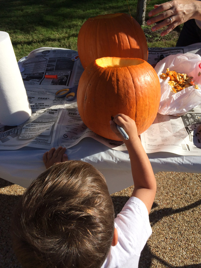 Nesse domingo fizemos as nossas abóboras de Halloween 2014, com a diferença que o pumpking carving (que é o ato de esculpir as abóboras) foi feito na casa de uma amiga, com um grupo de amigos brasileiros que queriam aprender também. Fomos nós levando as nossas abóboras, pumpkin carving kit, e disposição pra ficar no sol fazendo as nossas abóboras com mais um dia bem quente de outono por aqui. Algumas crianças maiores se interessaram por um tempo e depois abandonaram a tarefa, a Julia foi firme e forte e fez a sua abóbora até o final. Os pequenininhos só queriam saber de brincar e a gente tinha que ficar chamando pra eles lembrarem das abóboras. O Eric cortou um pouquinho e desenhou também. Acabou que os adultos fizeram mais que as crianças! Mas foi legal mesmo assim, as abóboras ficaram bem bacanas.