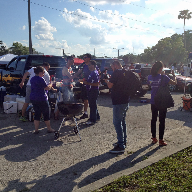 Chegamos ao estádio e a festa já começa lá fora com uma tradição americana que espantou os meus colegas brasileiros que nunca tinham visto: o tailgating. Os fãs chegam cedo, estacionam seus carros e fazem um churrasquinho de confraternização com outros fãs que estão ali também, todo mundo bebendo e comendo até a hora do jogo. Tailgating é super comum em eventos esportivos nos Estados Unidos, já vi em jogos de tudo quanto é tipo, mas principalmente em jogos de futebol americano – tanto da liga universitária quanto da liga profissional. Em dia de jogo do time de futebol aqui de Austin (os Longhorns) os estudantes estão a postos fazendo tailgating, não se espante que não é farofada de brasileiro em Orlando. Pra quem vai de carro, saia cedo de onde você estiver com muito tempo de folga pra chegar no estádio, porque o trânsito fica bem complicado.