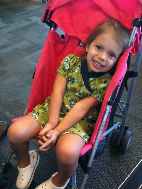 Esperando o voo pra Houston e depois, Rio! Julia fazendo hora sentada no carrinho (assistindo filme no computador, depois da foto), fazendo um lanchinho, brincando de andar pelo “tunel” entre as cadeiras e olhando os avioes parados em cada portao…